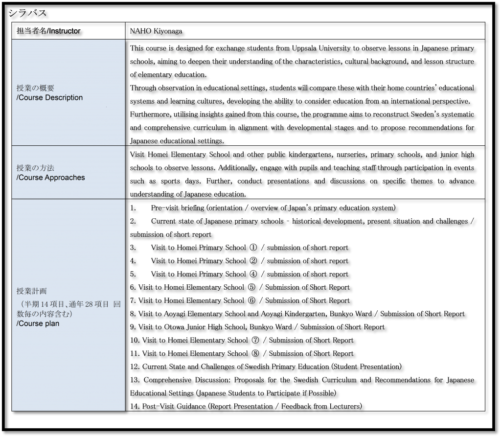 全て英語で以下の様な内容で講義を行うこととなりました。講義は「日本の初等教育」ですが。この中に安全教育をスーエデンとの比較で盛り込みたいと考えています。