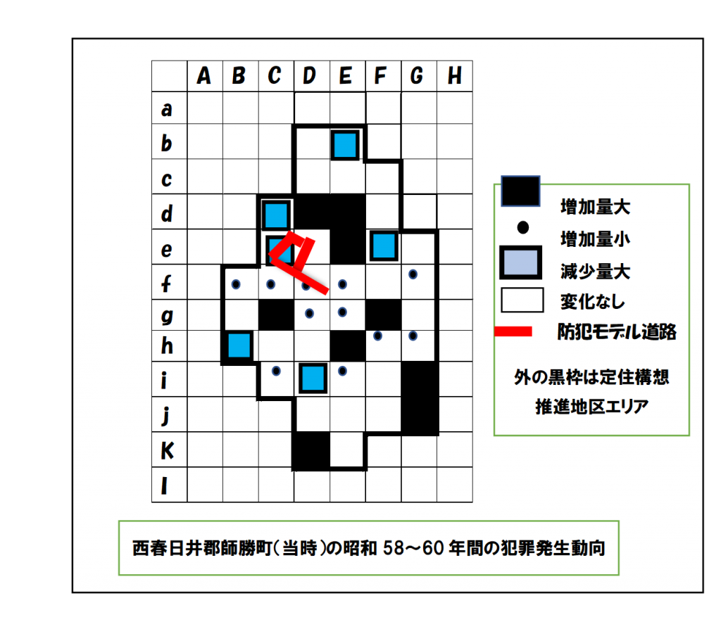 図は名古屋市守山区の白沢学区に隣接し防犯モデル道路及びモデル道路を「通学路」中心に設定した西春日井郡師勝町(当時)の「防犯モデル道路」を中心とした昭和58~60年間の犯罪発生状況をまとめたメッシュ図だ。