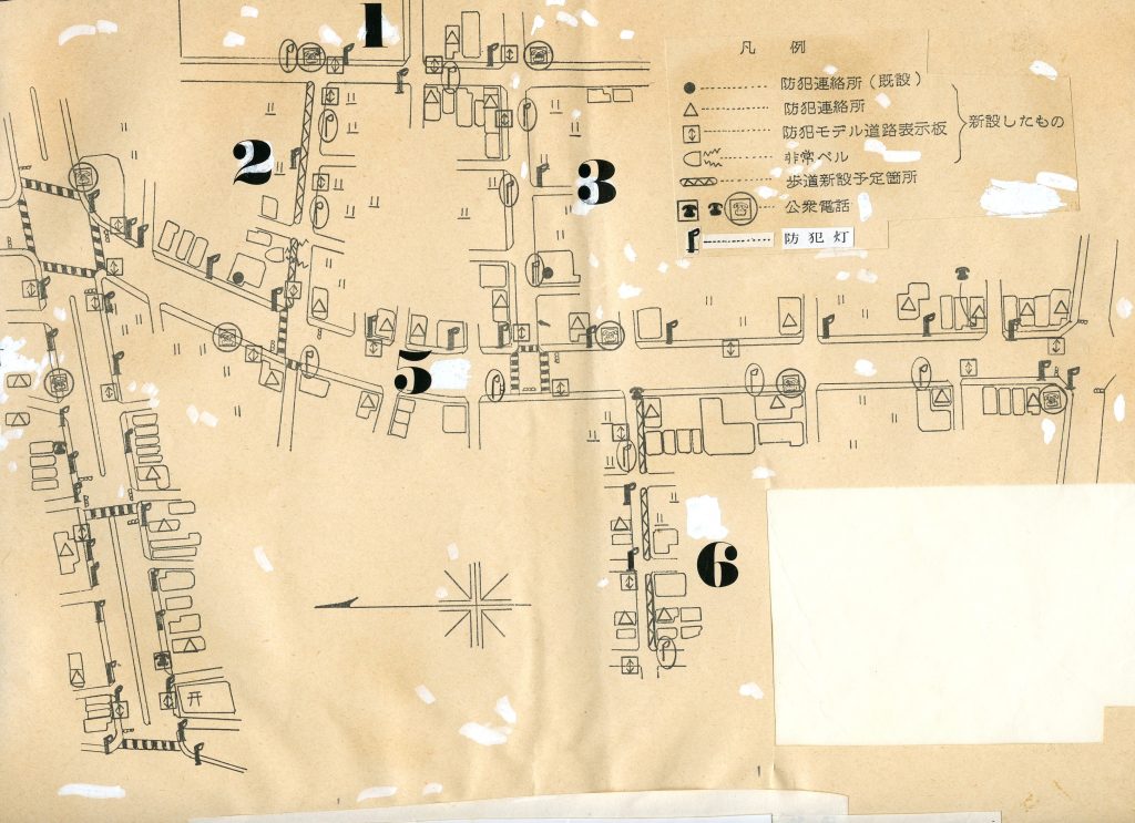 • 図が古く保存が悪かったため見えずらいかもしれないが、これが清永賢二が手書きした白沢学区の「防犯モデル道路図」である。