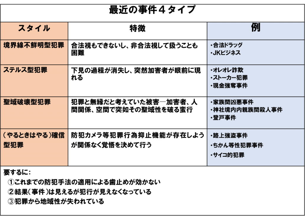 注目しているのは、最下表に示した最近の犯罪の4タイプと異なり(例えばごく最近の埼玉児童殺人事件は家庭という起こってはならない聖域で生じた「聖域破壊型犯罪」)、平凡な生活を営んでいる方々の上に降りかかった「非日常」な事件であること、犯人像がどうにも描き切れない(想像できない)こと、その事件目的が明確に把握できないこと(何のために)、検挙の遅いこと等でした