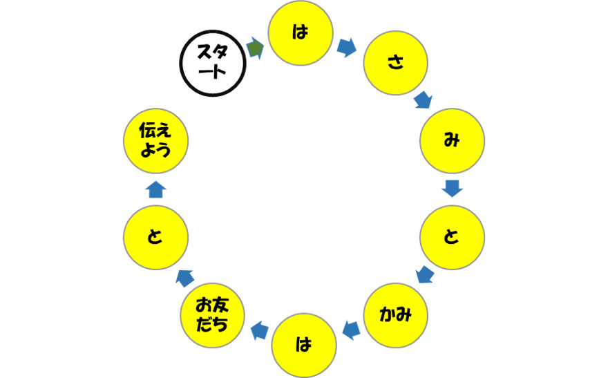 9つの「ハサミとカミお友だちと伝えよう」の輪がそれぞれどういうことをさしているかは、別な稿で書きましょう。