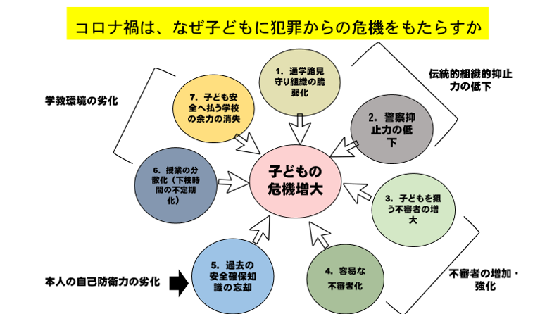 コロナウイルス禍(ミッド・ウイルス)にあっては、子ども見守りボランティアの眼が通学路から消えたと言うだけではない。大きく7つの原因が作用し子どもの危機を強めている(下図及び表参照)。
