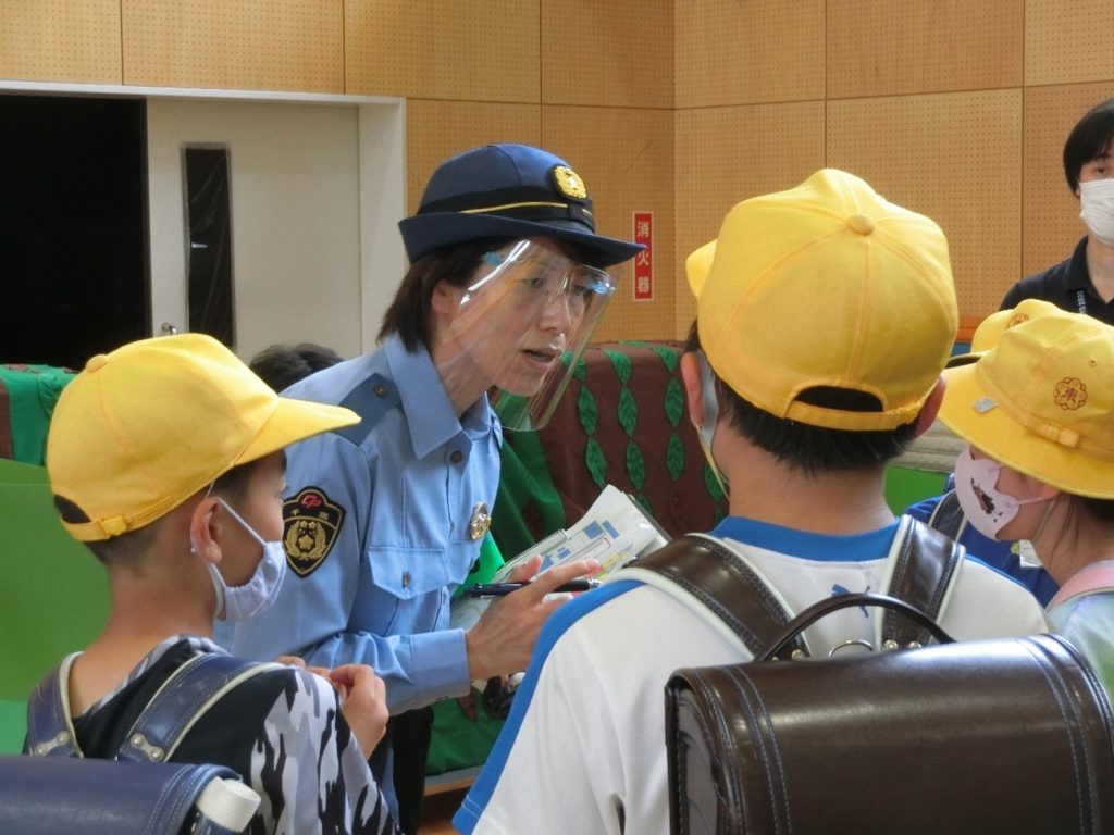 勿論、授業を受ける前、受けた後の態度変容調査も実施する手続きを取っています。子どもたちは、「その時どうする」を体得しただけでなく、施設内を巡回(パトロール)するお巡りさんに様々な質問をし、安全を守る警察官の役割などを学ぶことが出来ました。地域の見守りの方々とも地域安全について深い話しができました。