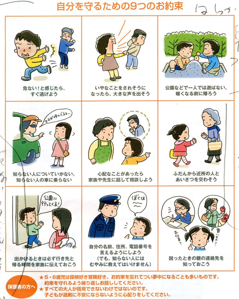 因みに「ハサミとカミハお友だちと伝えよう」は、最下表に示す平成16(2004)年に清永賢二が作成した世田谷区の園児の安全指導マニュアル「初めてのいってきます!~応援ブック」中の「9つのお約束」を基に、その後ステップ総合研究所が愛知県警の体験施設づくりでの実験・実際の事件現場観察・犯罪者との面接調査などを重ねた結果をさらに工夫したものです。