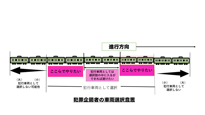 犯罪企図者の意思決定は、意図するか否かに関係なく、多くの場合罪種に関わらず極めて合理的になされる。その合理的行動の第1は、京王線のケースの前に起こった小田急線内での同種重大犯罪でもそうだったが、犯罪企図者は自分の狙い(一人でも多くの人を楽して犠牲にしたい)を最大にすることを目的とした「(自分の人生をかけた)車両選び(選択行動)」を行う。それは車両の「先頭と最後尾」のあまり人が乗っていない車両は、犯行車両としては選ばないという行動に表れる。しかし全く人の居ない、あるいは極少数の人間しか乗り合わせていない車両も避ける。その車両には「乗り込まない」。彼にとっての「獲物」が少ないことによる。(添付図1参照)。しかしあまりに混雑した車両も選択しない。自分の行動が制約されることによる。ほどほどにスキスキで、ほどほどに人の乗った車両(とその時間)が好まれる。私どもが面接した元犯罪者もそうであったが、犯罪企図者は、一般に実に我が儘であり利己的である。だから犯罪を実行できる。(この稿、続く)