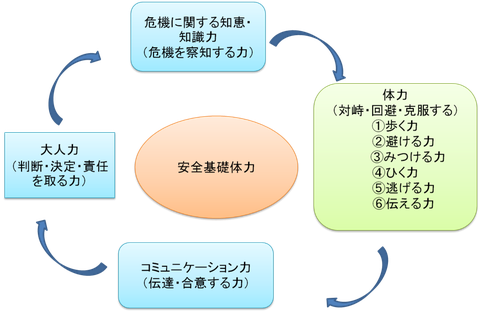 安全基礎体力は、「コミュニケーション力」「危機に対する知恵と知識」「体力」、