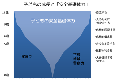 弊所は「安全基礎体力プログラム」(下記表)を用い様々な発達段階にそった内容で、体験的な安全教室を行ってきました(研究所内子どもの安全教育グループACE 2006年より)。2012年からはNPO法人体験型安全教育支援機構が主体となりこのプログラムを使用し、安全教育を実践しています。